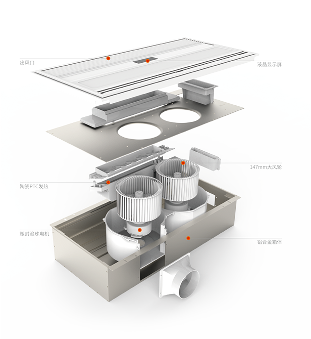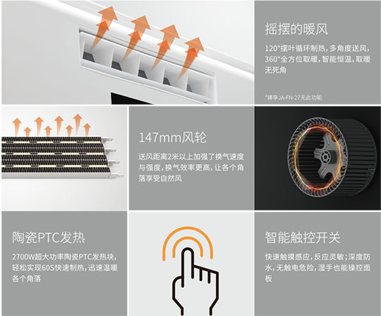 陶瓷PTC加热,通过不断循环来提高浴室温度,送热极为均匀。2700W大功率, 双核动力,高制热量系统设计,使发热效率更高,热损耗更低。高制热,快速温暖空间, 不仅让您畅享沐浴时光,即便在洗漱更衣区也可享受温暖。